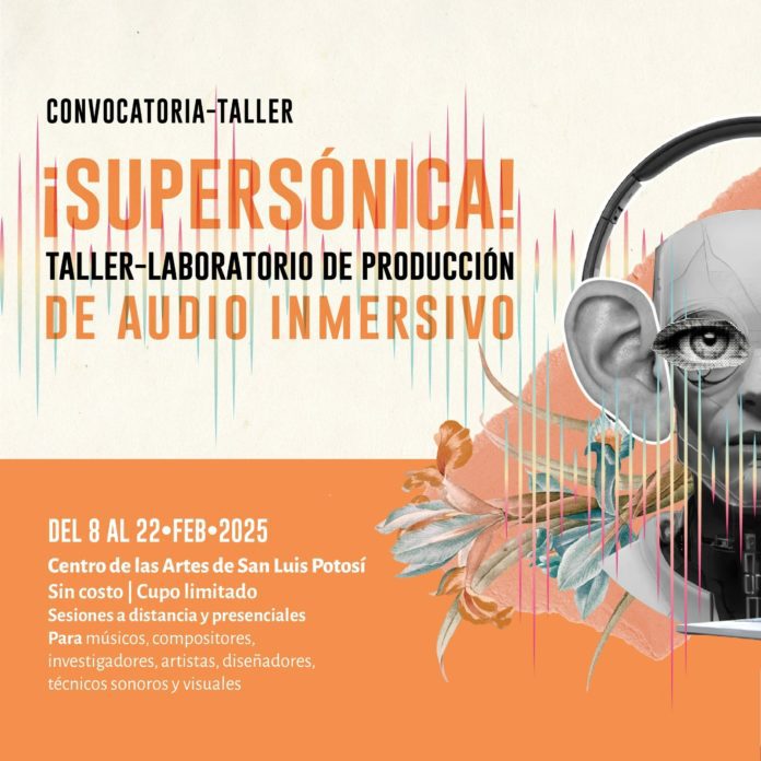La Secretaría de Cultura de Gobierno del Estado convoca a personas dedicadas a la música, composición, diseño de sonido e investigación a participar en «¡Supersonica!», un taller-laboratorio de producción de audio inmersivo, que se llevará a cabo del 8 al 22 de febrero en el Centro de las Artes de San Luis Potosí.