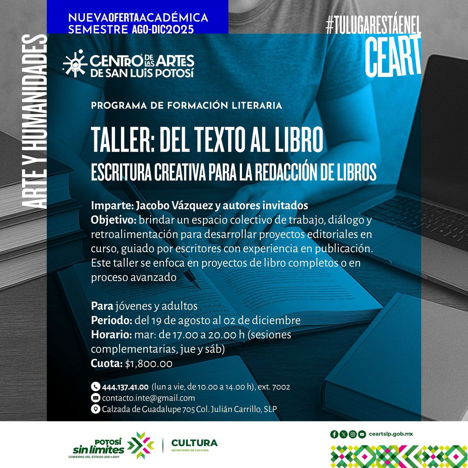 El taller inició 19 de agosto y concluirá el 2 de diciembre, con sesiones los martes de 17:00 a 20:00 horas y actividades opcionales los jueves y sábados. El costo es de mil 800 por persona y las inscripciones están abiertas en el módulo de Servicios Escolares del Ceart. Consulta más detalles en: https://linktr.ee/ceartsanluis.