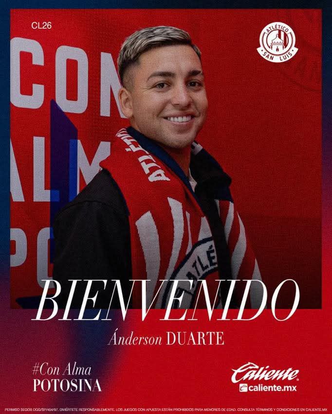 El Club Atlético de San Luis informa la llegada de su primer refuerzo de cara al torneo Clausura 2026, se trata de Anderson Duarte, futbolista uruguayo de 21 años que se incorpora procedente de Mazatlán FC.