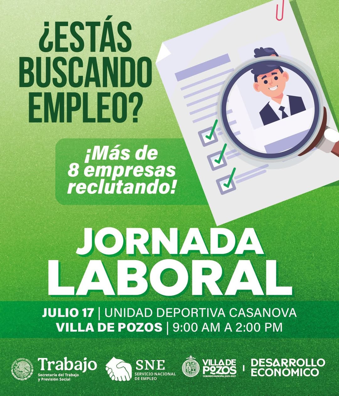 El Gobierno Municipal de Villa de Pozos, a través de la Dirección de Desarrollo Económico y en coordinación con la Secretaría de Trabajo y Previsión Social, llevará a cabo una Jornada Laboral el próximo jueves 17 de julio, con el objetivo de fortalecer la empleabilidad y fomentar el emprendimiento en la localidad.