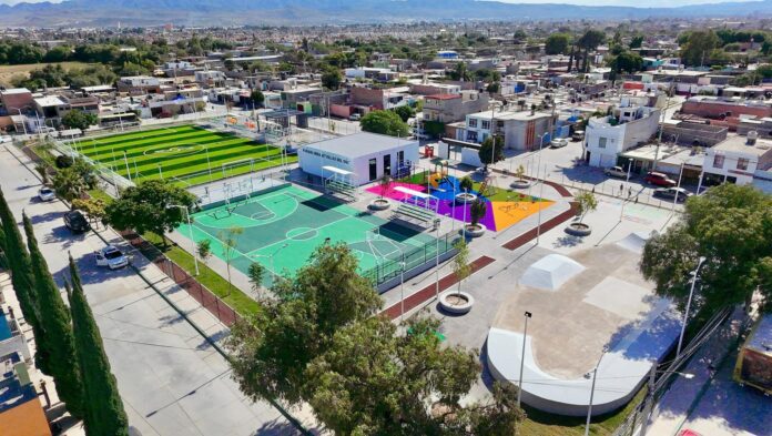 El nuevo parque cuenta con cancha deportiva, trotapista, juegos infantiles con pasto sintético, iluminación led y un módulo de usos múltiples, beneficiando a niñas, niños, jóvenes y adultos mayores, así como con una Purificadora gratuita.