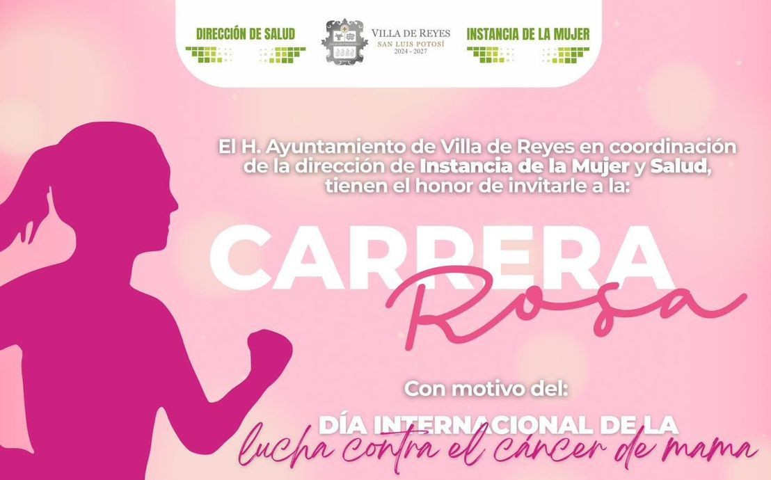 El Ayuntamiento de Villa de Reyes, encabezado por el presidente municipal Ismael Hernández Martínez, convoca a la población a sumarse a la “Carrera Rosa”, en el marco del Día Internacional de la Lucha contra el Cáncer de Mama, que se llevará a cabo este viernes 17 de octubre a las 9:00 de la mañana, teniendo como punto de partida el Jardín Principal de la cabecera municipal.
