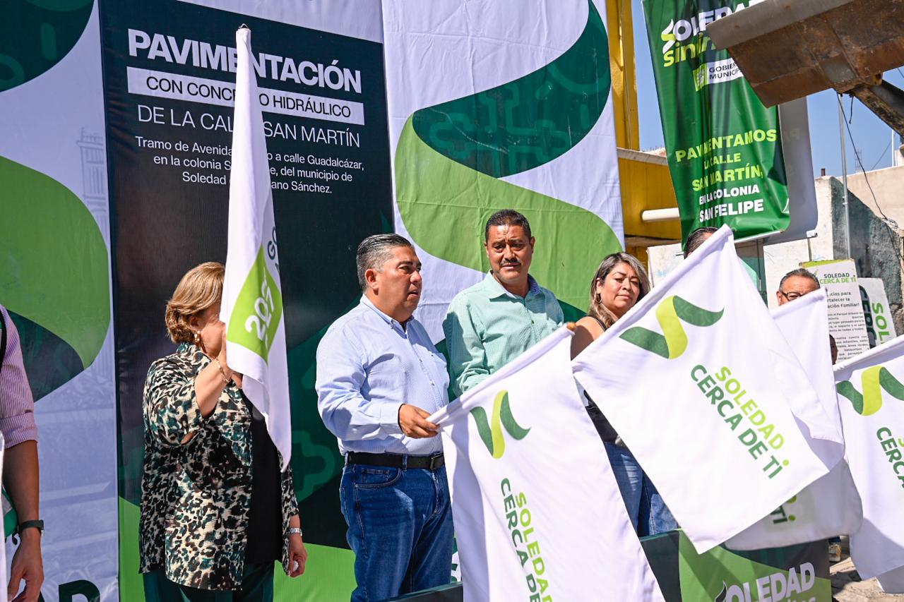 El Alcalde de Soledad de Graciano Sánchez, Juan Manuel Navarro Muñiz, dio este día el banderazo de arranque a la pavimentación con concreto hidráulico de la calle San Martín, en el tramo que comprende de avenida México a calle Guadalcázar, en la colonia San Felipe, con una inversión de más de 3 millones de pesos; este proyecto forma parte del plan integral de rehabilitación urbana que el Gobierno Municipal impulsa en esta colonia, donde previamente se concluyó la pavimentación de la calle Santa Catarina.