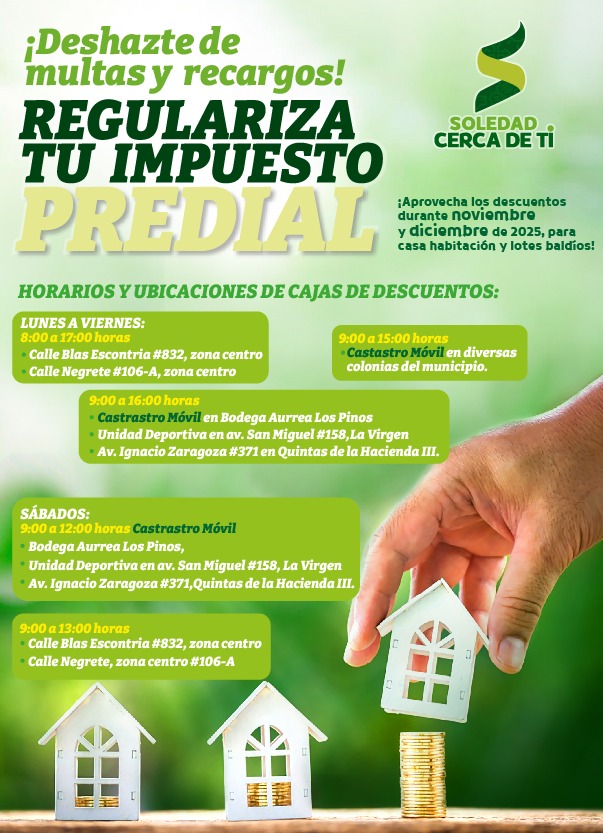 Con el propósito de incentivar la regularización de las y los contribuyentes y apoyar la economía de las familias del municipio, el Ayuntamiento de Soledad de Graciano Sánchez anuncia el inicio del programa de descuentos en multas y recargos por el pago del Impuesto Predial, a partir de este 1° de noviembre, una estrategia instruida por el Alcalde Juan Manuel Navarro Muñiz, que busca también fortalecer los servicios básicos en favor de toda la población