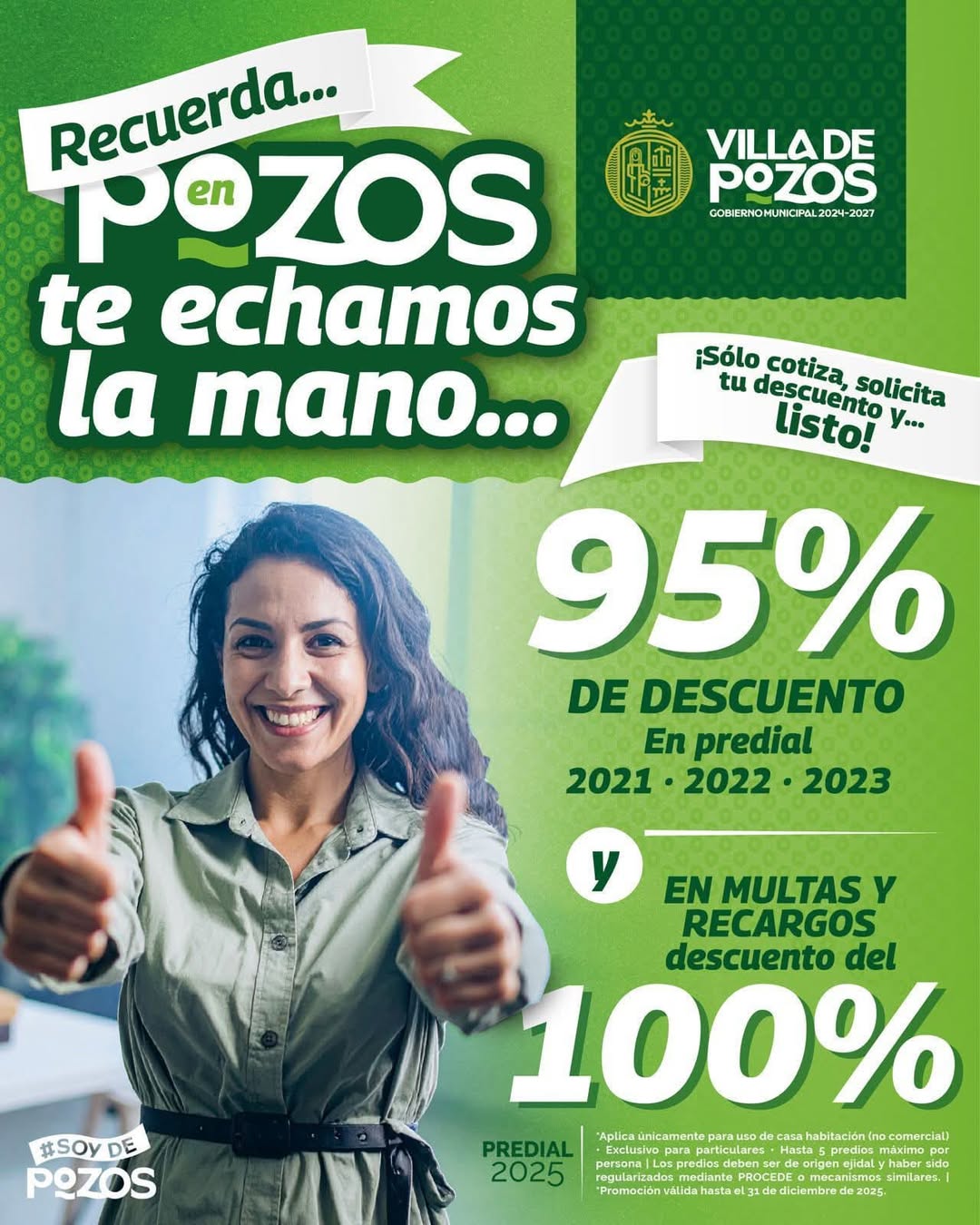 El Gobierno Municipal de Villa de Pozos informa a la ciudadanía que mantiene vigente el programa “En Pozos te echamos la mano”, una iniciativa que busca apoyar la economía de las familias y fomentar la regularización del patrimonio mediante atractivos estímulos fiscales en el pago del impuesto predial.