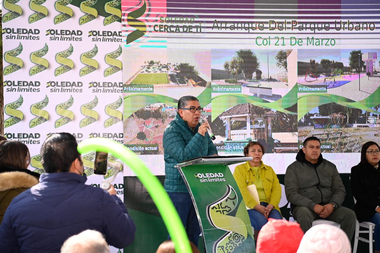 Juan Manuel Navarro Muñiz, Alcalde de Soledad de Graciano Sánchez, dio hoy el banderazo de arranque a una obra histórica y un gran anhelo social: la construcción del Parque Urbano en la colonia 21 de Marzo, con una inversión superior a los 9.3 millones de pesos que beneficiará de manera directa e indirecta a más de 14 mil 200 habitantes; este proyecto rescata un espacio abandonado y sin uso social, para convertirlo en un punto de encuentro seguro, cercano y digno para las familias, jóvenes, niñas, niños y adultos mayores del sector.