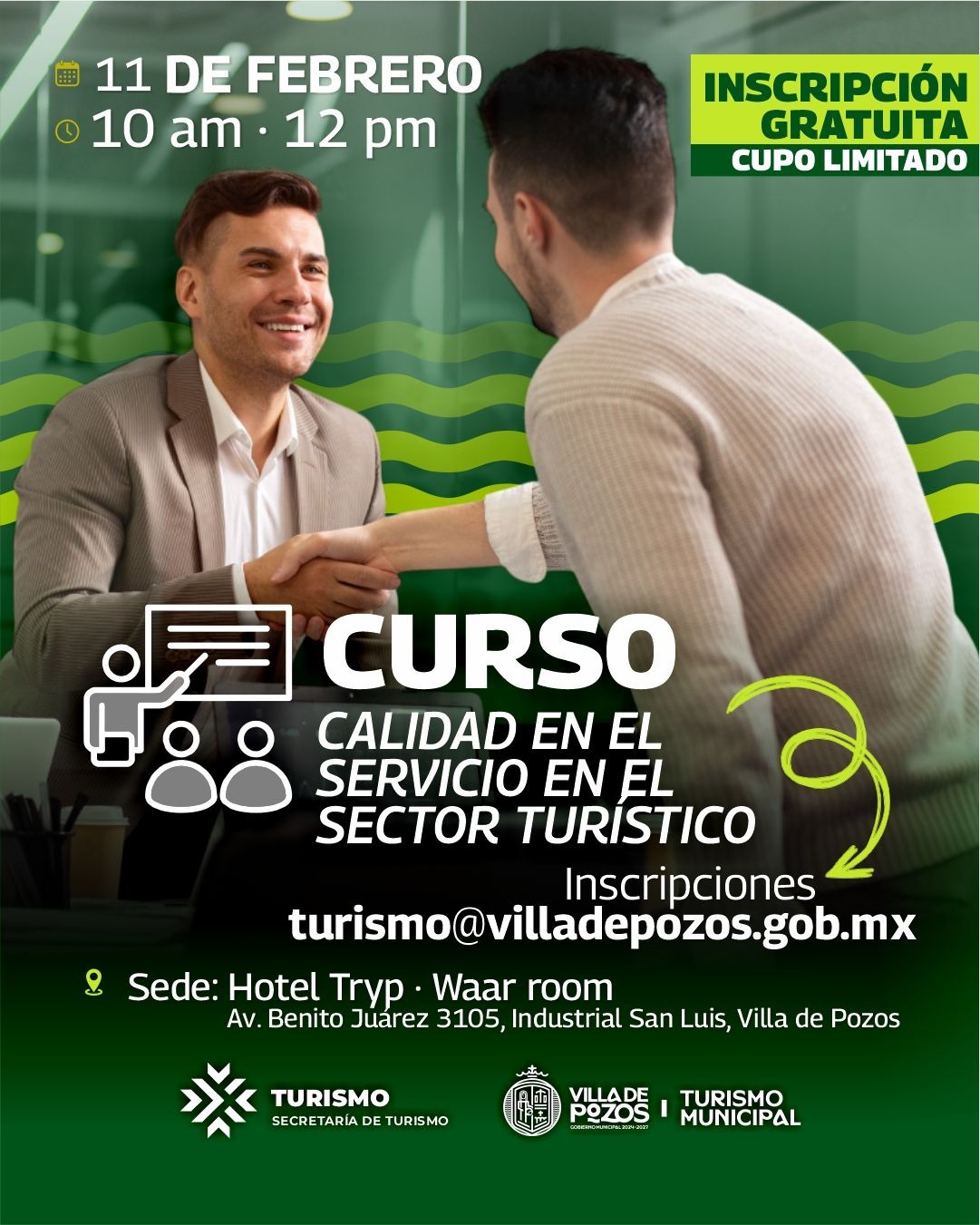 Con el objetivo de fortalecer la atención y profesionalización de los prestadores de servicios turísticos, la Dirección de Turismo Municipal de Villa de Pozos, lanzó la convocatoria para participar en la capacitación “Calidad en el Servicio en el Sector Turístico”, que se llevará a cabo el miércoles 11 de febrero, impartida por personal especializado de la Secretaría de Turismo del Estado.