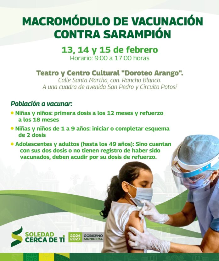 El Gobierno de Soledad de Graciano Sánchez invita a toda la ciudadanía a atender este llamado, acudir al módulo emergente y aprovechar la jornada, reafirmando el compromiso del Ayuntamiento y del Alcalde Juan Manuel Navarro Muñiz de estar cerca de las familias, promoviendo la salud pública y la prevención de enfermedades para garantizar el bienestar de la niñez, los jóvenes, adultos y sectores vulnerables de la comunidad.