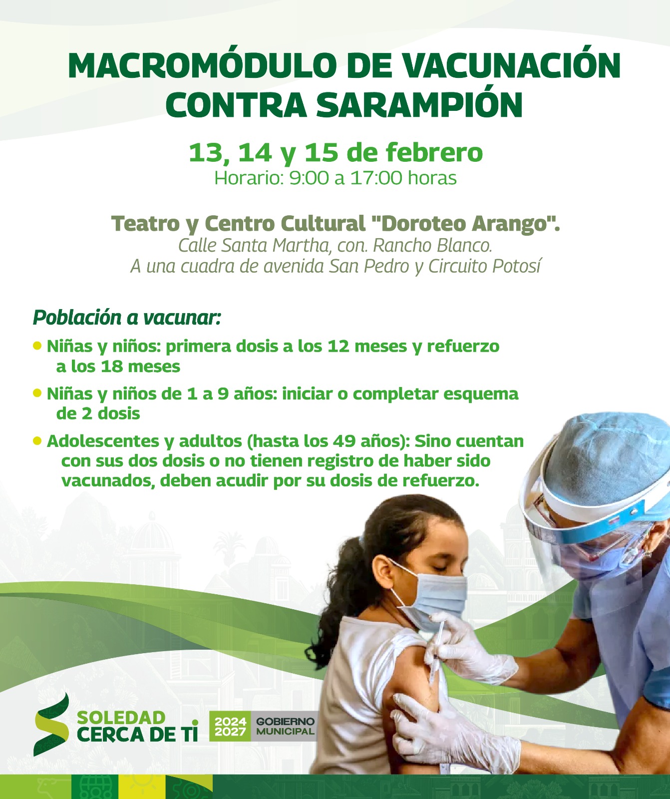 Para cuidar la salud de niñas, niños y personas en situación de riesgo, y ante el registro de contagios a nivel nacional, el Ayuntamiento de Soledad de Graciano Sánchez instaló un módulo emergente de vacunación contra el sarampión, para fortalecer la prevención de la población y garantizar que las familias tengan acceso cercano y seguro a la protección que merecen, gracias a la gestión del Alcalde Juan Manuel Navarro Muñiz, quien instruye que la atención a la población sea siempre cercana y efectiva.