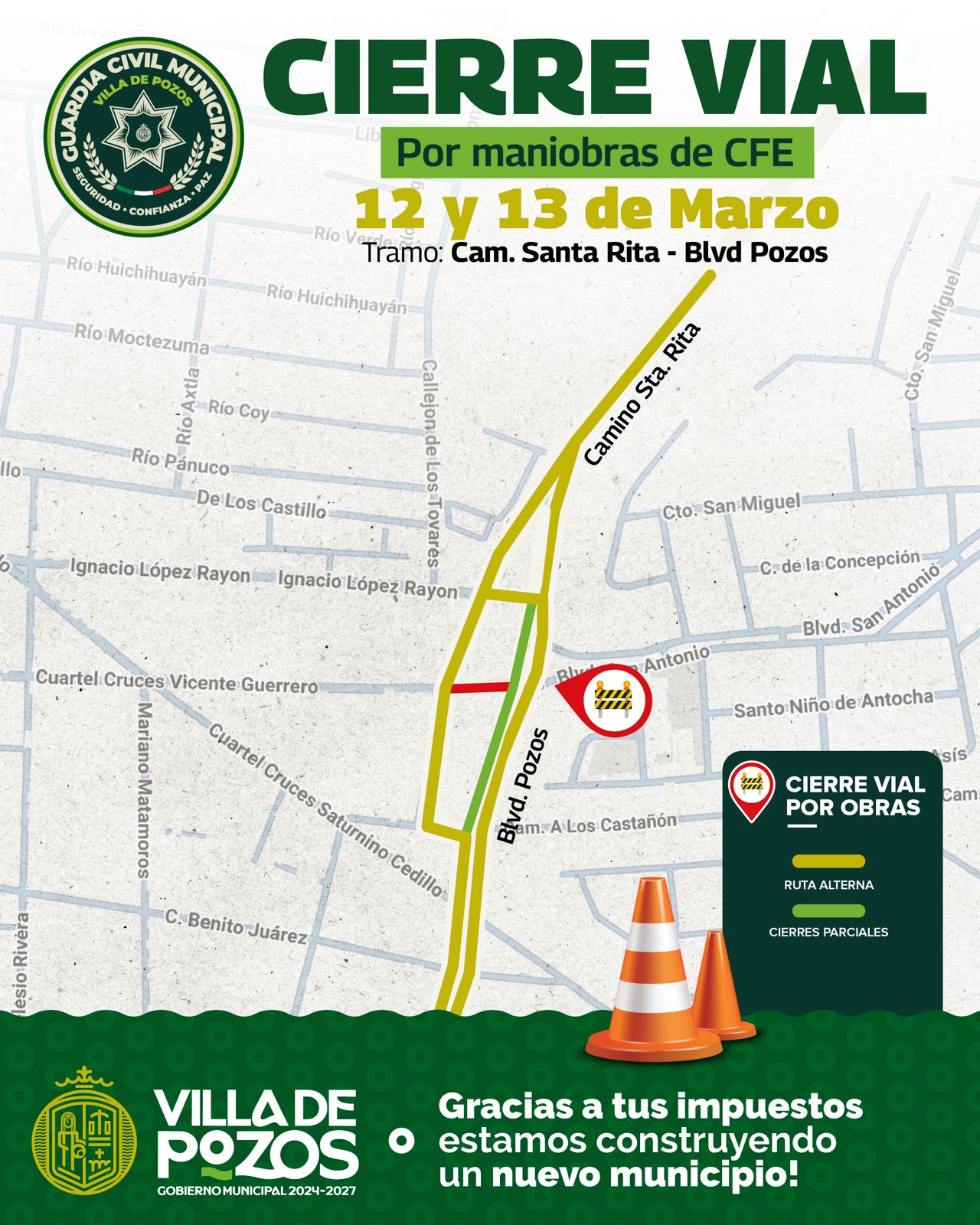 En este sentido, la Dirección de Vialidad de la Guardia Civil Municipal dio a conocer que implementará un dispositivo vial con motivo del cierre de la calle Vicente Guerrero, en el tramo comprendido de Camino a Santa Rita a bulevar Pozos, así como un cierre parcial en bulevar Pozos, en el tramo de Ignacio Rayón a Camino a Los Castañón, los días 12 y 13 de marzo.