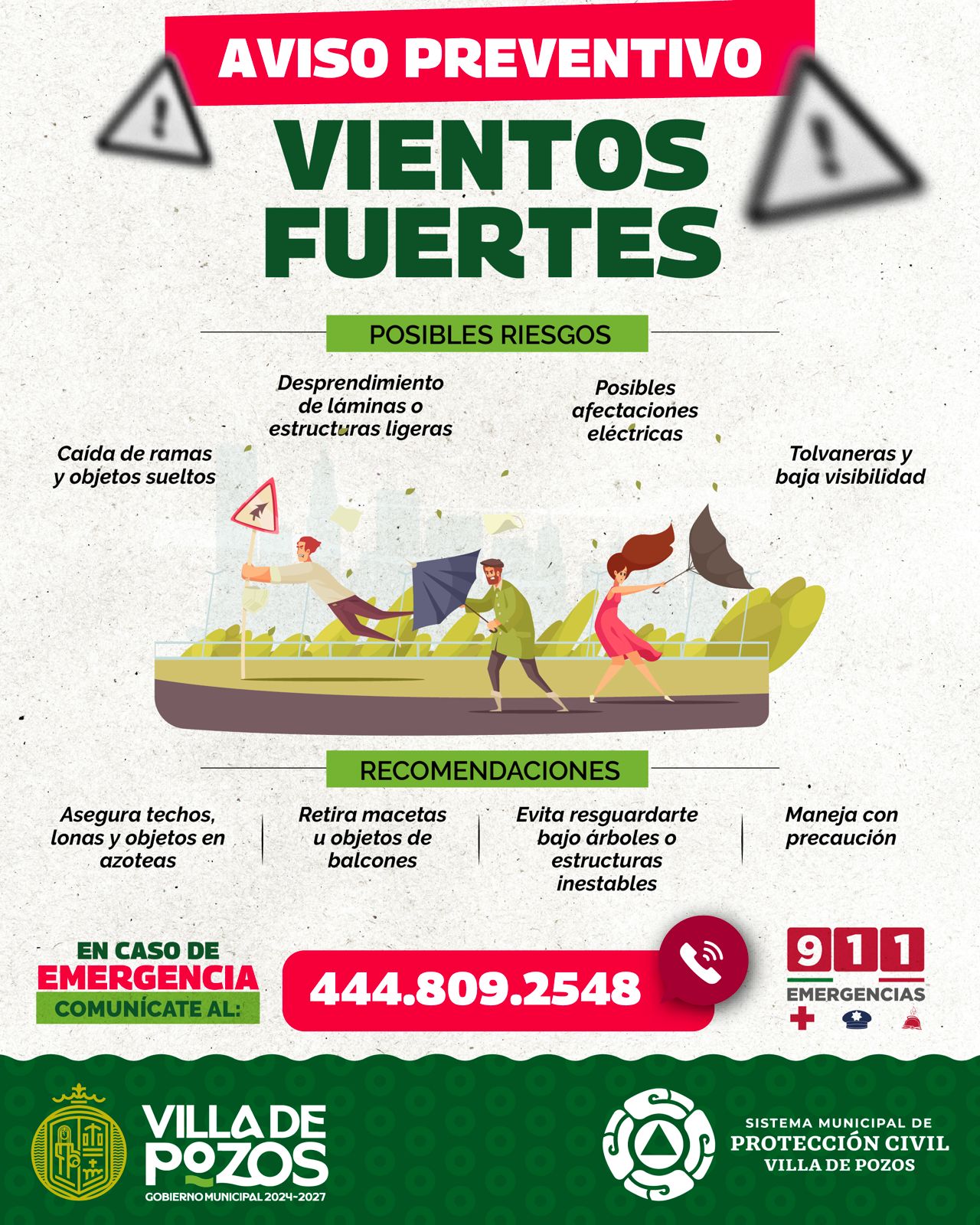 Ante las rachas de viento registradas recientemente en el municipio, la Dirección de Protección Civil Municipal de Villa de Pozos hace un llamado a la ciudadanía a extremar precauciones y tomar medidas preventivas para evitar accidentes o situaciones de riesgo.