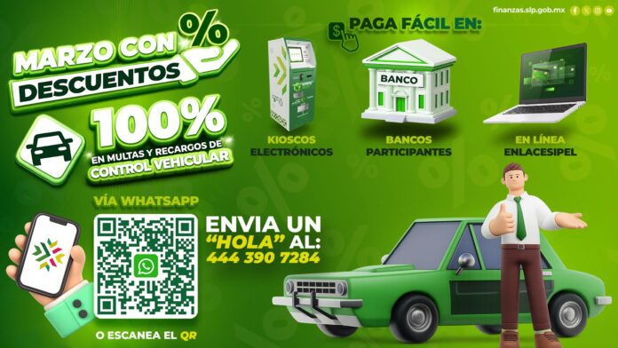 Como parte del respaldo sin límites del Gobernador Ricardo Gallardo Cardona, a la economía de las familias potosinas, la Secretaría de Finanzas (Sefin) informó que durante todo marzo continuará vigente el descuento del 100 por ciento en multas y recargos de control vehicular, beneficio que forma parte del cambio que se vive y se siente con una administración moderna que acerca facilidades a la ciudadanía.