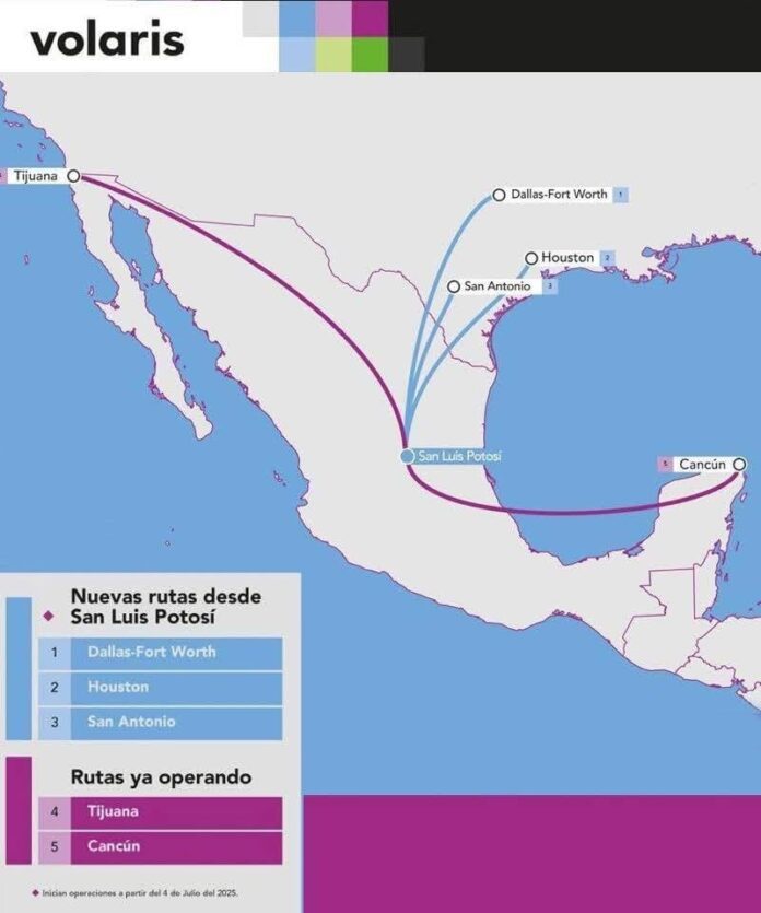 Como resultado de las gestiones del Gobernador de San Luis Potosí Ricardo Gallardo Cardona, a partir del próximo 4 de julio entrarán en operación nuevas rutas aéreas que conectarán directamente a la entidad con tres de las principales ciudades del estado de Texas: Dallas, Houston y San Antonio, a través de la aerolínea Volaris.