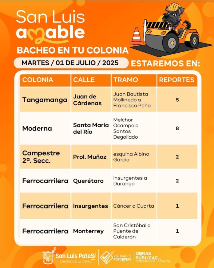 Con el fin de que la población tome las medidas pertinentes y considere los cierres parciales a la circulación, la Dirección de Obras Públicas informó que se trabajará en el Fraccionamiento Tangamanga, en la calle Juan de Cárdenas, entre Mollinedo y Francisco Peña; en la Colonia Moderna, calle Santa María del Río, de Melchor Ocampo a Santos Degollado.