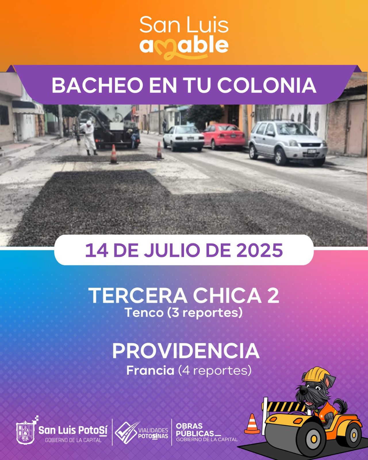 Este lunes 14 de julio se continúa con la atención a reportes que envía la ciudadanía, con 40 atenciones en las calles de: Rubén Darío en la colonia Valle Verde; Luis de Molina del fraccionamiento Tangamanga; Costa Rica, colonia Santuario; Antonio Villaseñor, en el tramo de Niño Artillero a Fray Antonio Vázquez Espinoza, colonia Universitaria; Estrella, de Granizo a Centella, en la colonia Garita de Jalisco; calle Costado Sur Central Camionera, entre Virgo y Géminis, colonia Capricornio; Salvador Nava, en el tramo de Vicente Rivera a Puente Pemex, Nuevo Paseo; Tenco, en el tramo de Puente de Ixtla a Gualiname, en la colonia Tercera Chica 2; Francia, de Italia a Roma, colonia Providencia; y las calles de Portal de Las Mercedes, y Haciendas de México, en la colonia Haciendas de México.