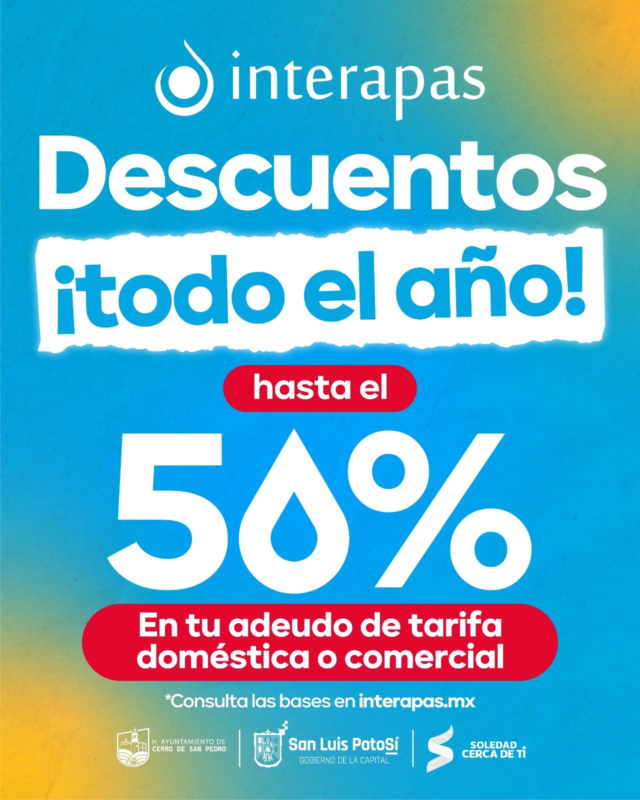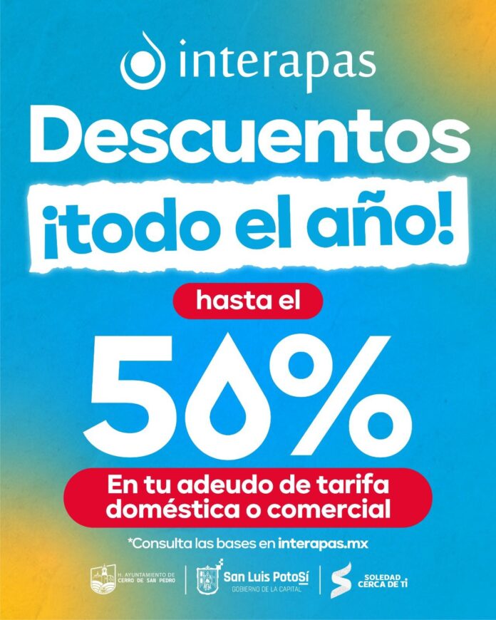 Gracias a la respuesta positiva de los potosinos y el compromiso del organismo con las familias potosinas, INTERAPAS recuerda que la vigencia del programa se mantiene todo el año, con el objetivo de que más usuarios puedan regularizar su situación de adeudos.