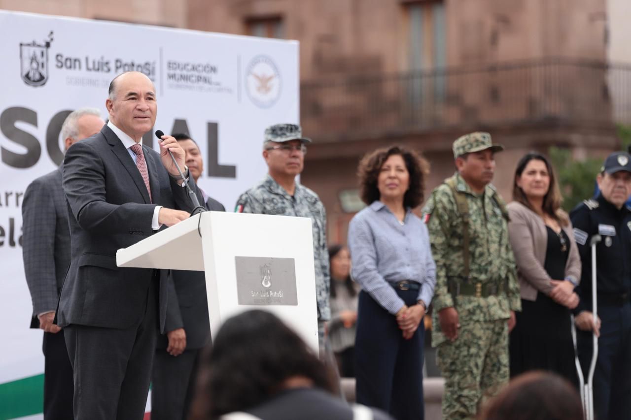 En el inicio de actividades, el Alcalde capitalino encabezó el Lunes Cívico Social en la Plaza de Los Fundadores para rendir honores a los simbolos patrios, junto con la presidenta del DIF Municipal, Estela Arriaga Márquez y el coordinador estatal de la Guardía Nacional, General Brigadier Gaudencio Ramos Jiménez, donde se resaltó la importancia de impulsar no sólo mejores prácticas docentes, sino también fomentar el respeto a los valores cívicos.