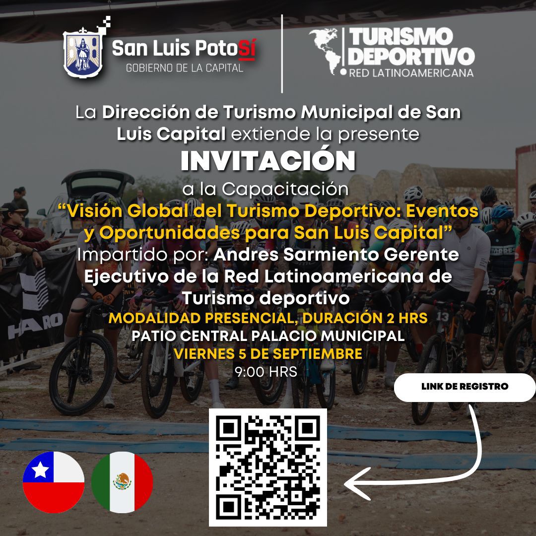 La Dirección de Turismo Municipal de San Luis Capital invita a la capacitación “Visión Global del Turismo Deportivo: Eventos y Oportunidades para San Luis Capital”, que será impartida por Andrés Sarmiento, Gerente Ejecutivo de la Red Latinoamericana de Turismo Deportivo.