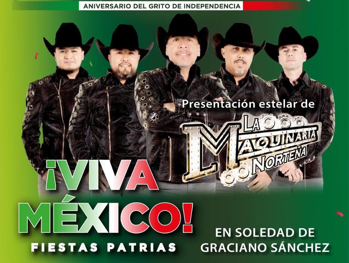 El Presidente municipal de Soledad de Graciano Sánchez, Juan Manuel Navarro Muñiz extendió una invitación a todas las familias a ser parte de una noche especial, llena de música, tradición, gastronomía y patriotismo, al celebrar el CCXV aniversario de la Independencia de México, una festividad que estará protagonizada en lo musical con la agrupación La Maquinaria Norteña.
