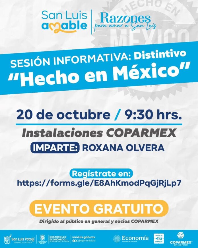 Con el objetivo de brindar herramientas que fortalezcan la identidad y competitividad de productos locales, la dirección de Desarrollo Económico del ayuntamiento de San Luis Potosí y la Confederación Patronal de la República Mexicana (Coparmex), invitan a la sesión informativa distintivo “Hecho en México”, que será impartida por Roxana Olvera.