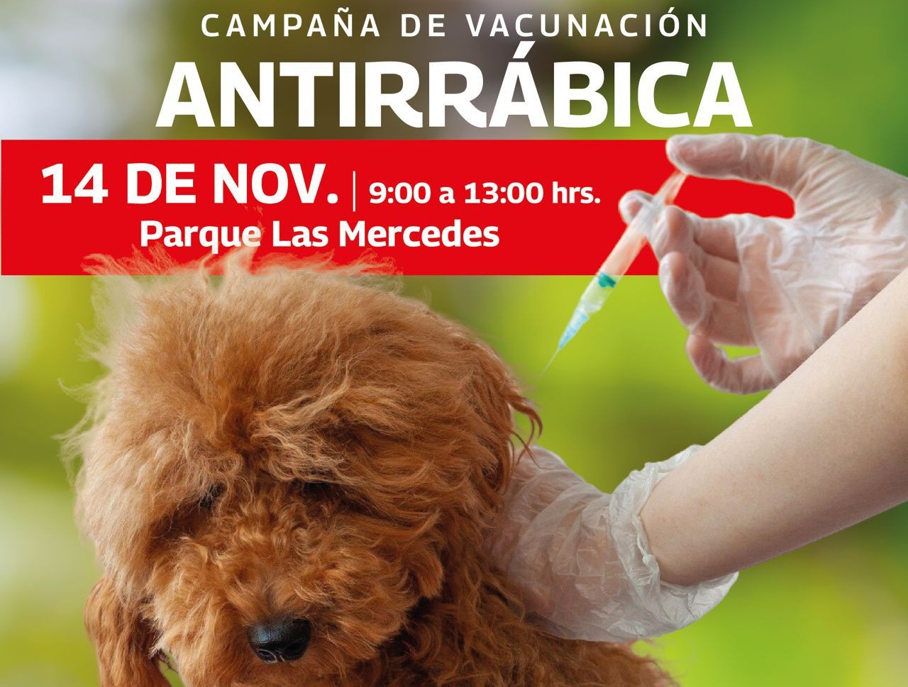 A través de Bienestar Animal, se realizará una campaña de vacunación antirrábica el 14 de noviembre en el Parque Las Mercedes de 09:00 a 13:00 horas.