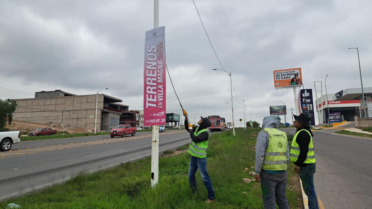 La Junta Estatal de Caminos fortalece la mejora integral del Circuito Potosí con operativos permanentes de retiro de pendones, espectaculares y diversos tipos de propaganda colocados sin autorización. En este sentido, desarrollan recorridos continuos a lo largo de los más de 40 kilómetros de esta vía, con el objetivo de eliminar el ruido visual y recuperar una imagen urbana acorde con un desarrollo moderno y sin límites.