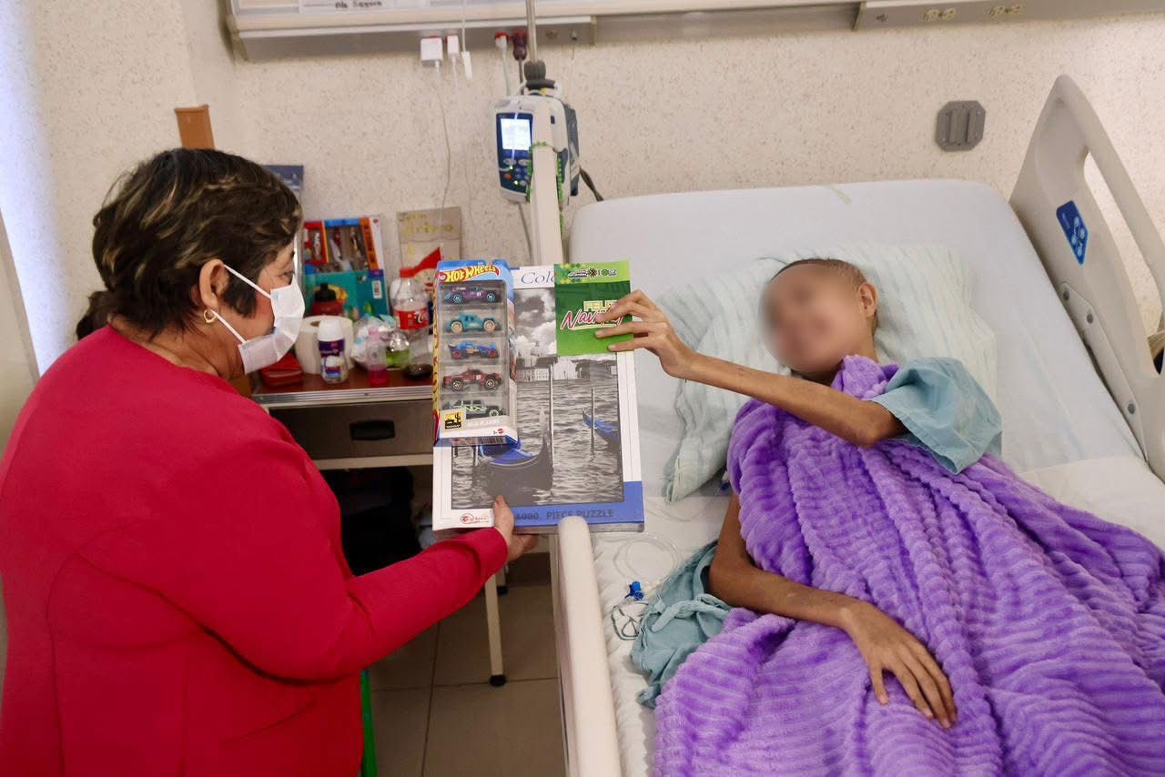 Durante la visita, la directora general del DIF Estatal, Virginia Zúñiga Maldonado, entregó obsequios a niñas y niños de las áreas de Pediatría y Urgencias, con el propósito de generar un ambiente de cariño y esperanza durante su atención médica. Destacó que estas acciones reflejan el compromiso del Gobierno del Estado de apoyar sin límites el bienestar emocional y el desarrollo integral de la niñez.