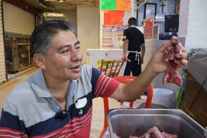 Nos dice Camilo que en el mercado República son ya 49 años vendiendo liebres, conejos y ahora ratas de monte en la entrada al mercado.