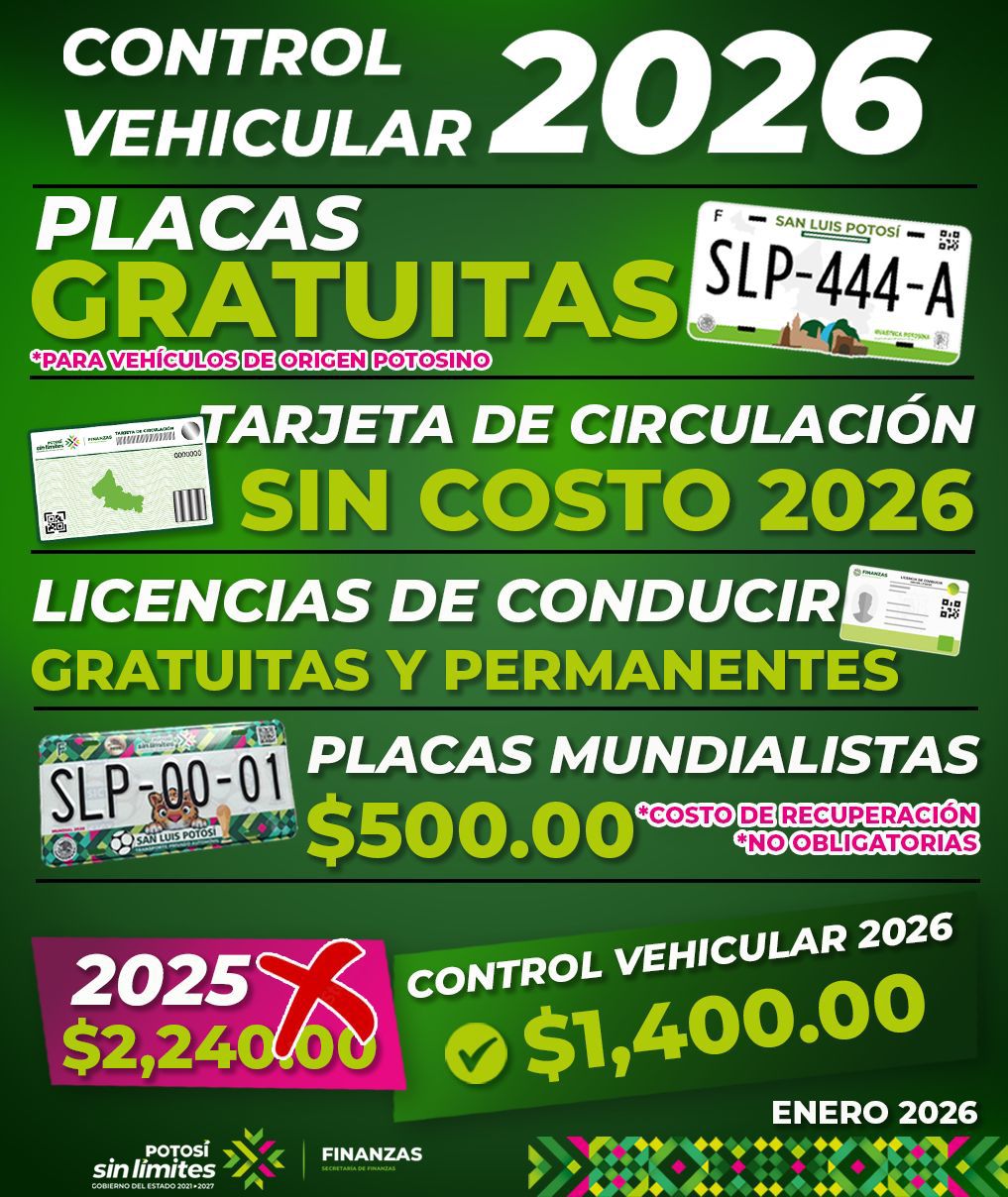 El Gobierno del Estado de San Luis Potosí informó que para el ejercicio fiscal 2026 el costo del control vehicular se reducirá de manera significativa, al pasar de dos mil 240 pesos en 2025 a solo mil 400 pesos.