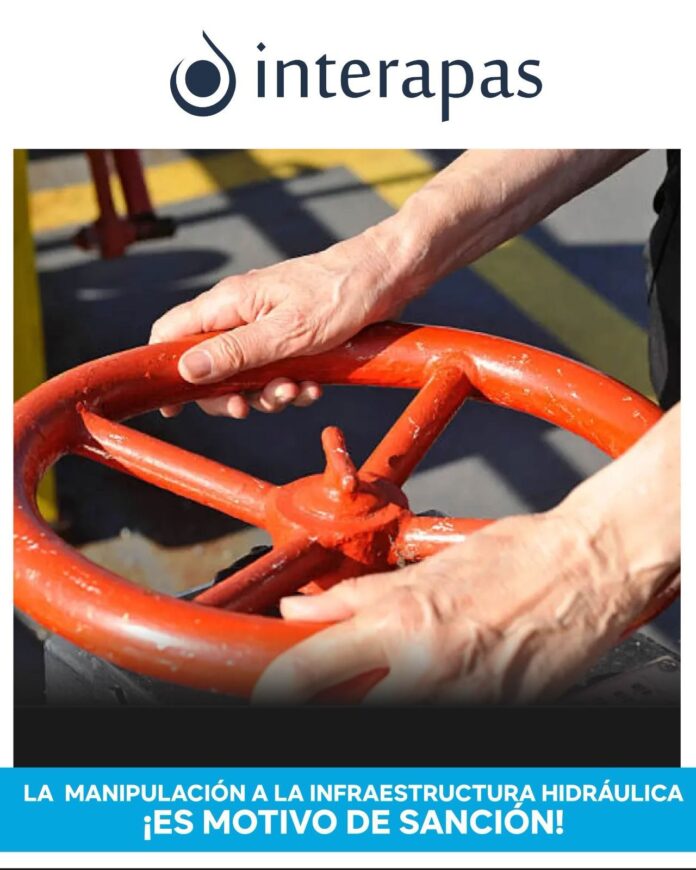 El organismo operador de agua INTERAPAS, pide a la ciudadanía cuidar y proteger la infraestructura hidráulica pública y a denunciar de manera inmediata cualquier daño o manipulación indebida de pozos de visita, cajas de válvulas, registros y demás instalaciones del sistema de agua potable.