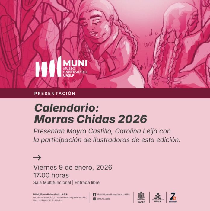 La Universidad Autónoma de San Luis Potosí (UASLP), a través de la Secretaría de Difusión Cultural y el Museo Universitario (MUNI), invita al público en general a la presentación del calendario “Morras Chidas 2026”, que se llevará a cabo el viernes 9 de enero de 2026, a las 17:00 horas, en la Sala Multifuncional, con entrada libre.