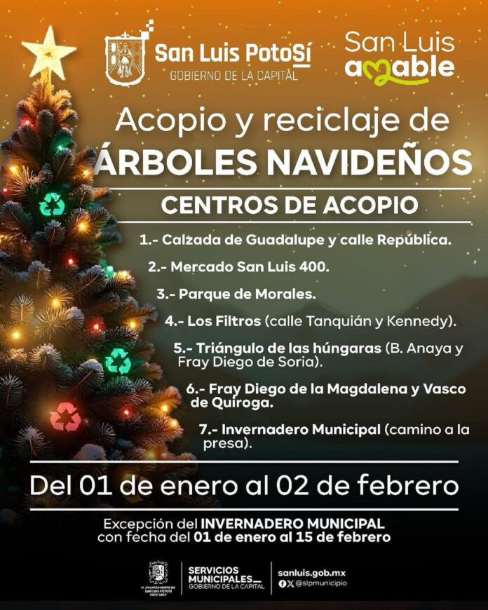 Indicó que los centros de acopio estarán operando todo el mes de enero y hasta el 2 de febrero. Las ubicaciones son: en la Calzada de Guadalupe y Calle República; en el Mercado San Luis 400; en el Parque Morales y en la parte trasera de la Planta Los Filtros, en la confluencia de las calles Tanquíán y Kennedy.