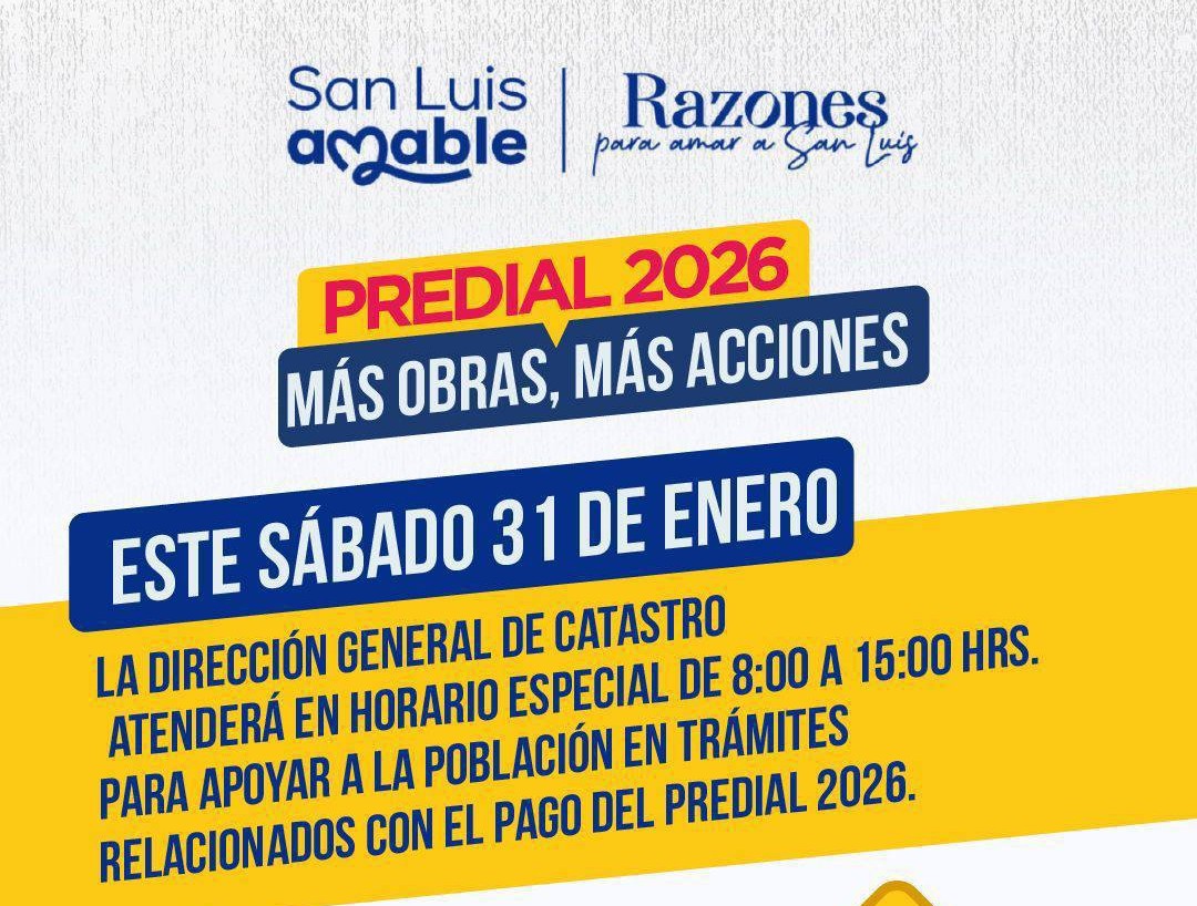 El Gobierno de la Capital informa a la población que, como parte de las acciones para incentivar el cumplimiento del pago del Predial 2026, este sábado 31 de enero las cajas recaudadoras municipales permanecerán abiertas en horario especial de 8:00 a 15:00 horas, permitiendo a las y los contribuyentes realizar su trámite de manera ágil y accesible.