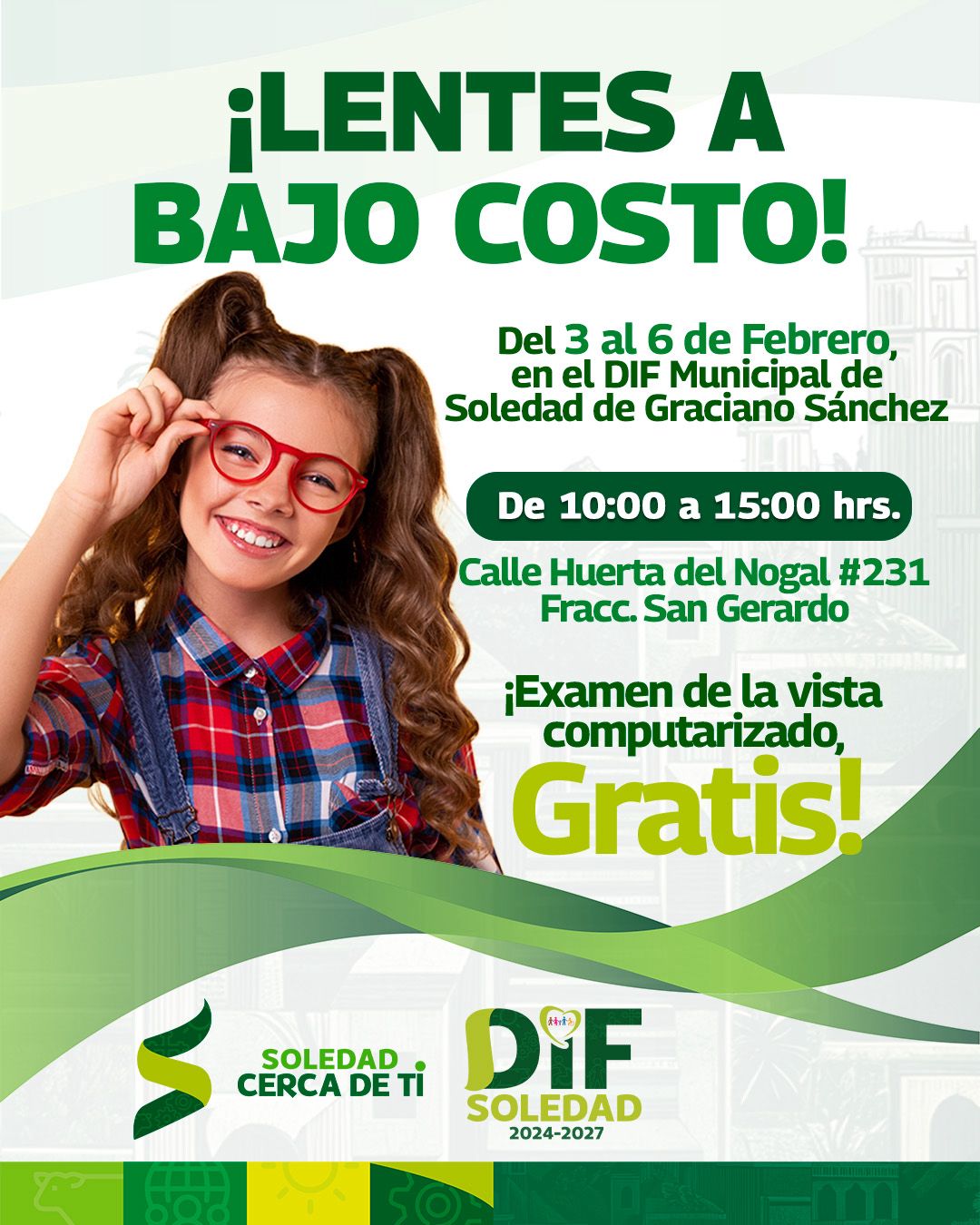 Con el propósito de cuidar la salud visual y fortalecer la economía de las familias, el Ayuntamiento de Soledad de Graciano Sánchez, a través del Sistema Municipal para el Desarrollo Integral de la Familia (DIF), lleva a cabo, esta semana, la Campaña de Lentes a Bajo Costo, vigente del 3 al 6 de febrero, en un horario de 10:00 a 15:00 horas, con atención directa, sin necesidad de cita previa y con personal especializado que realiza el examen de la vista y orienta a cada beneficiario y beneficiaria.
