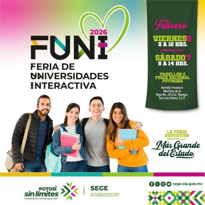 La educación tendrá un papel central con la Feria de Universidades Interactiva (FUNI) 2026, organizada por la Secretaría de Educación de Gobierno del Estado (SEGE), que se realizará el viernes 6 y sábado 7 de febrero en el Pabellón 2 de la Fenapo, acercando a las juventudes la oferta educativa más amplia del estado, mientras que la cultura y la tradición se vivirán con el Día Nacional del Auto Antiguo el domingo 22 de febrero.
