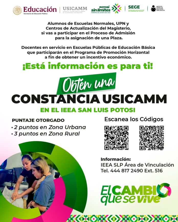 La colaboración entre el IEEA SLP, que lidera el Prof. José Luis Castro Castillo, y la Unidad del Sistema para la Carrera de las Maestras y los Maestros (USICAMM), abre sus puertas a estudiantes de Formación Magisterial de las Escuelas Normales, UPN y Centros de Actualización del Magisterio, que deseen participar en el proceso de admisión para la asignación de una Plaza, Docentes en Servicio en Escuelas Públicas para participar en el proceso de Promoción Horizontal.