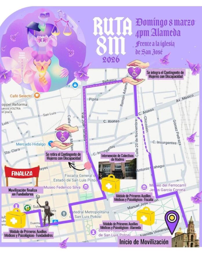 De acuerdo con la convocatoria difundida por las organizadoras, la movilización iniciará frente a la iglesia de San José, en la Alameda, desde donde el contingente avanzará por Avenida Universidad para incorporarse a Manuel José Othón, continuar por calles del Centro Histórico y seguir el trayecto que incluye 20 de Noviembre, Eje Vial y Reforma, pasando por el jardín de San Juan de Dios antes de dirigirse hacia el primer cuadro de la ciudad.