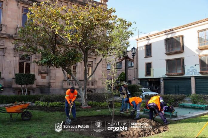 El Ayuntamiento de San Luis Potosí, a través de la Dirección de Servicios Municipales, llevó a cabo una jornada de reforestación estratégica en la Plaza del Carmen, uno de los puntos más representativos del Centro Histórico. Como parte de estas acciones, una cuadrilla operativa de Parques y Jardines integró un encino roble y un encino siempre verde, especies de gran tamaño que adornan las áreas verdes de este espacio.